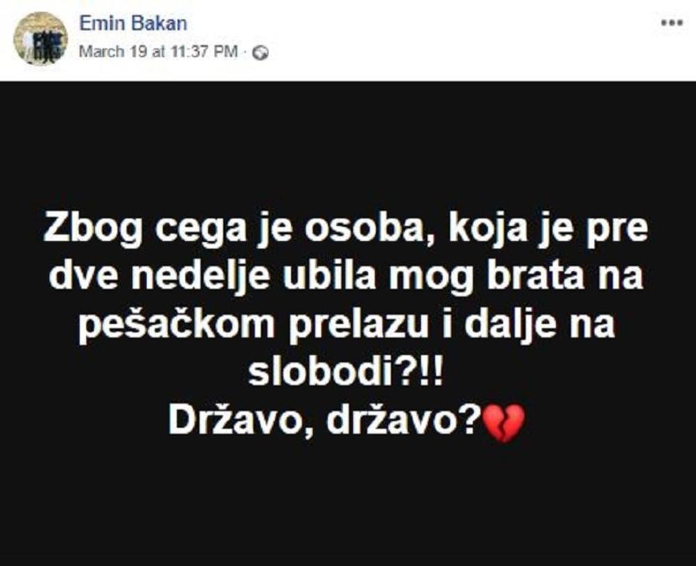 "I nije bitno je li Beograd, Novi Pazar ili Bačka Topola, a nije ni bitno je li Ernad, Stefan, Emina ili Marija, bitno je da je to dete koje je prelazilo ulicu, koje su roditelji naučili da pričeka dok vozila stanu, a onda pređe preko pešačkog, jer je to sada njegova prednost, dete koje je sada ubijeno, a da pritom odgovorni za njegovu smrt jos uvek nije zasluženo kažnjen. Ne znam, meni su moji roditelji uvek govorili o pravednostima sistema u drugim državama, o opasnostima koje nosi ljudska neodgovornost, a mi nažalost u svojoj, sada već 17 dana čekamo da se zadovolji pravda zbog smrti našeg prijatelja, brata, sina, čoveka, izazvanoj usled bahatosti i neopreza neke tamo osobe, koja sedi u automobilu i drži volan u ruci. Jedan život je ugašen, ne može se vratiti, ali da bar neka vrsta spokoja bude podarena njegovim roditeljima, najbližim ljudima, jer je od njih jedan deo tela već pre 17 dana odsečen. Stidi se sistemu, stidi se državo. Neka majčina suza bude molitva. Svi smo mi Ernad Bakan", napisala je Emina.
