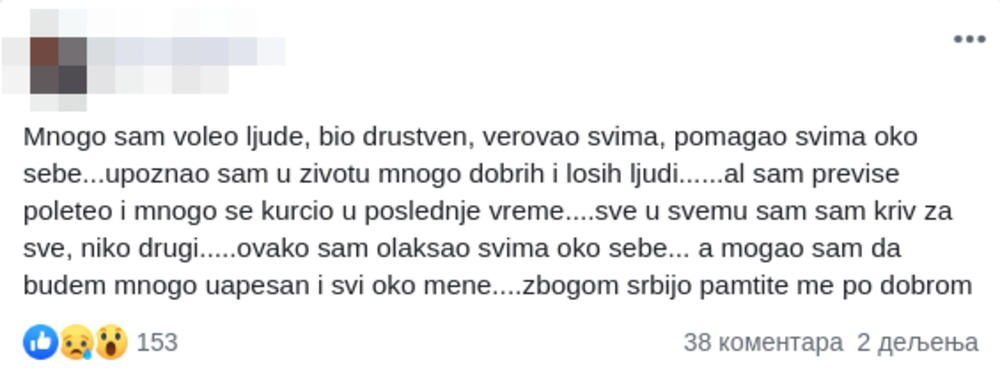 - Mnogo sam voleo ljude, bio društven, verovao svima, pomagao svima oko sebe. Upoznao sam u životu mnogo dobrih i loših ljudi, ali sam previše poleteo i mnogo se ku*čio u poslednje vreme. Sve u svemu, sam sam kriv za sve, niko drugi. Ovako sam olakšao svima oko sebe, a mogao sam da budem mnogo uspešan i svi oko mene. Zbogom, Srbijo, pamtite me po dobrom – napisao je Maričić na Fejsbuku, i to samo nekoliko minuta pre smrti.