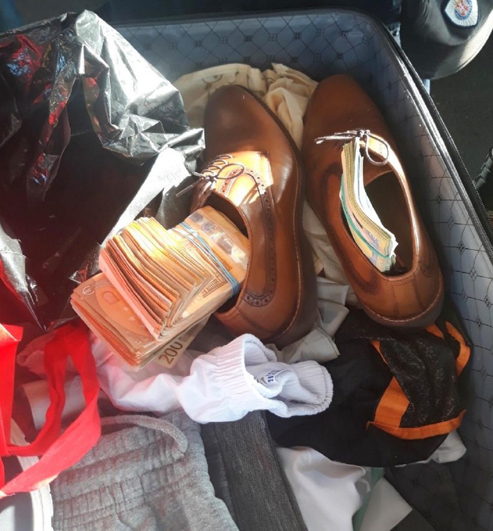 Tada je u spakovanim cipelama 49-godišnjeg suvozača pronađen koverat sa 14.400 neprijavljenih evra, dok je u putnoj torbi 45-godišnjeg vozača, među košuljama pronađena koverta sa 67.500 evra.