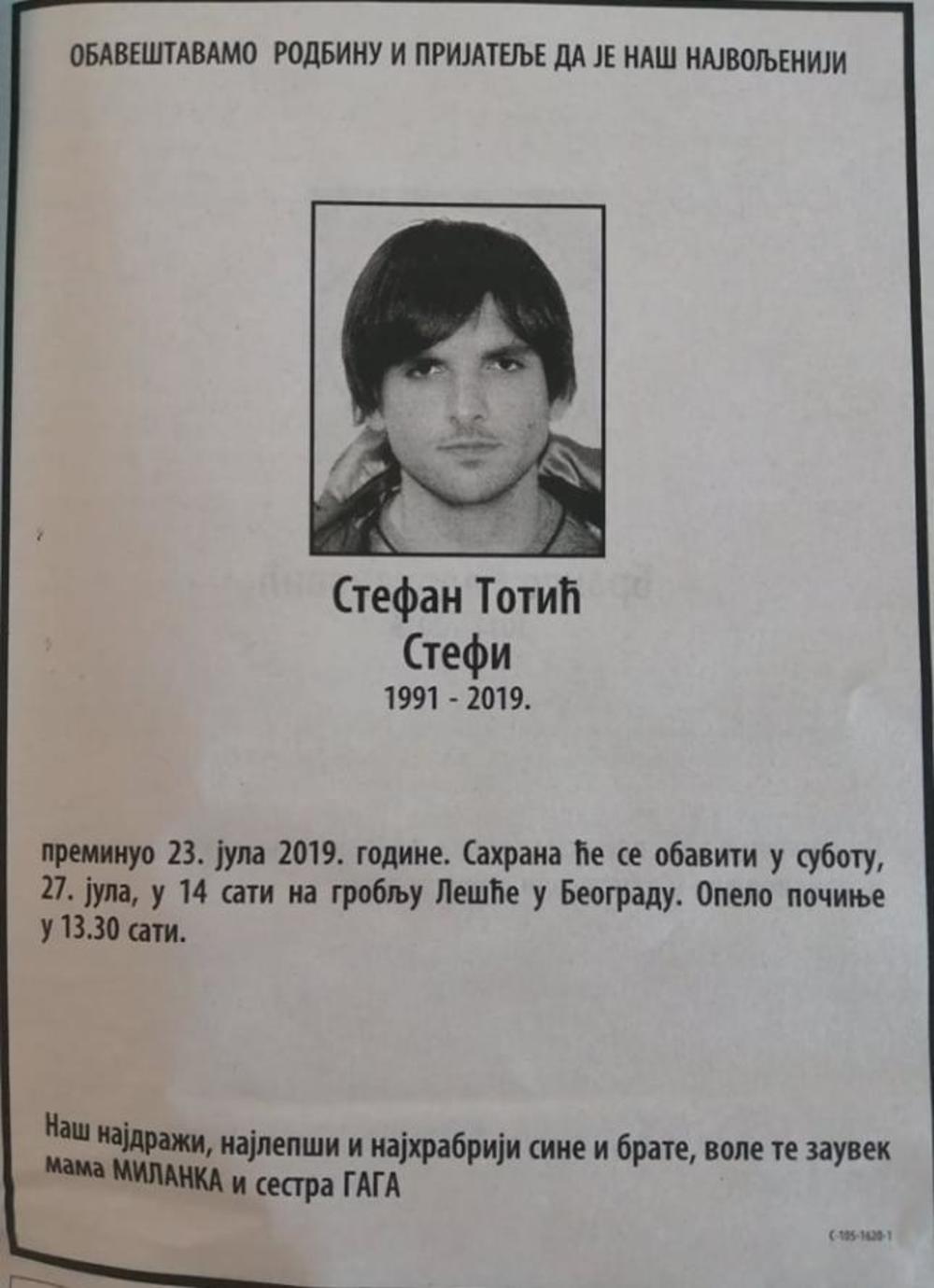 Porodica i mnogobrojni prijatelji čituljama u jutrašnjim izdanjima dnevnih novina opraštaju se od Stefana.
