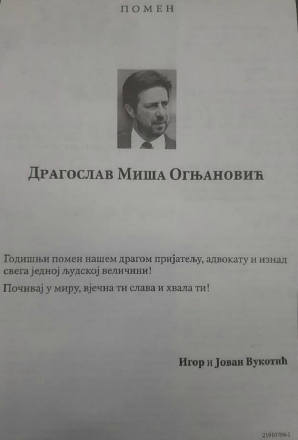 - Godišnji pomen našem dragom prijatelju, advokatu i iznad svega jednoj ljudskoj veličini! Počivaj u miru, večna ti slava i hvala ti - napisala su braća Vukotić, koje je Ognjanović godinama zastupao.