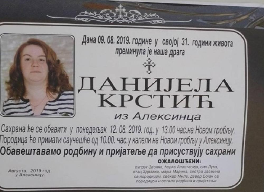 Kako se saznaje, Danijela je bila zdrava žena i 9. avgusta se porodila u aleksinačkoj bolnici, a prema rečima izvora, danima je bila na indukciji. Sahranjena je u ponedeljak na Novom groblju u Aleksincu, a njen suprug Zvonko Krstić je na Fejsbuk profilu pokojne supruge napisao da je do smrti došlo greškom lekara, kao i da je Danijela umrla zbog njihove nemarnosti, neodgovornosti i bahatosti.
