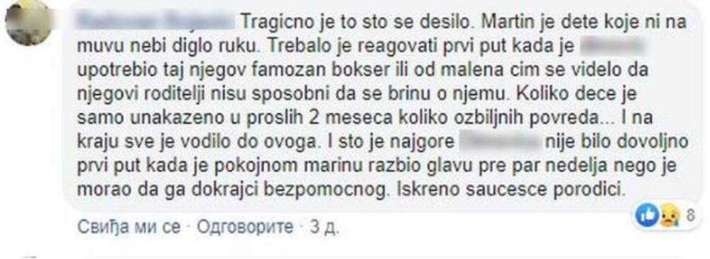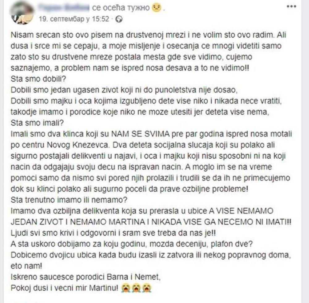Poruka koju je na Fejsbuku ostavio jedan stanovnik Novog Kneževca, koji kaže da je poznavao Martina i njegovu mamu, naročito je uzbudila javnost.
