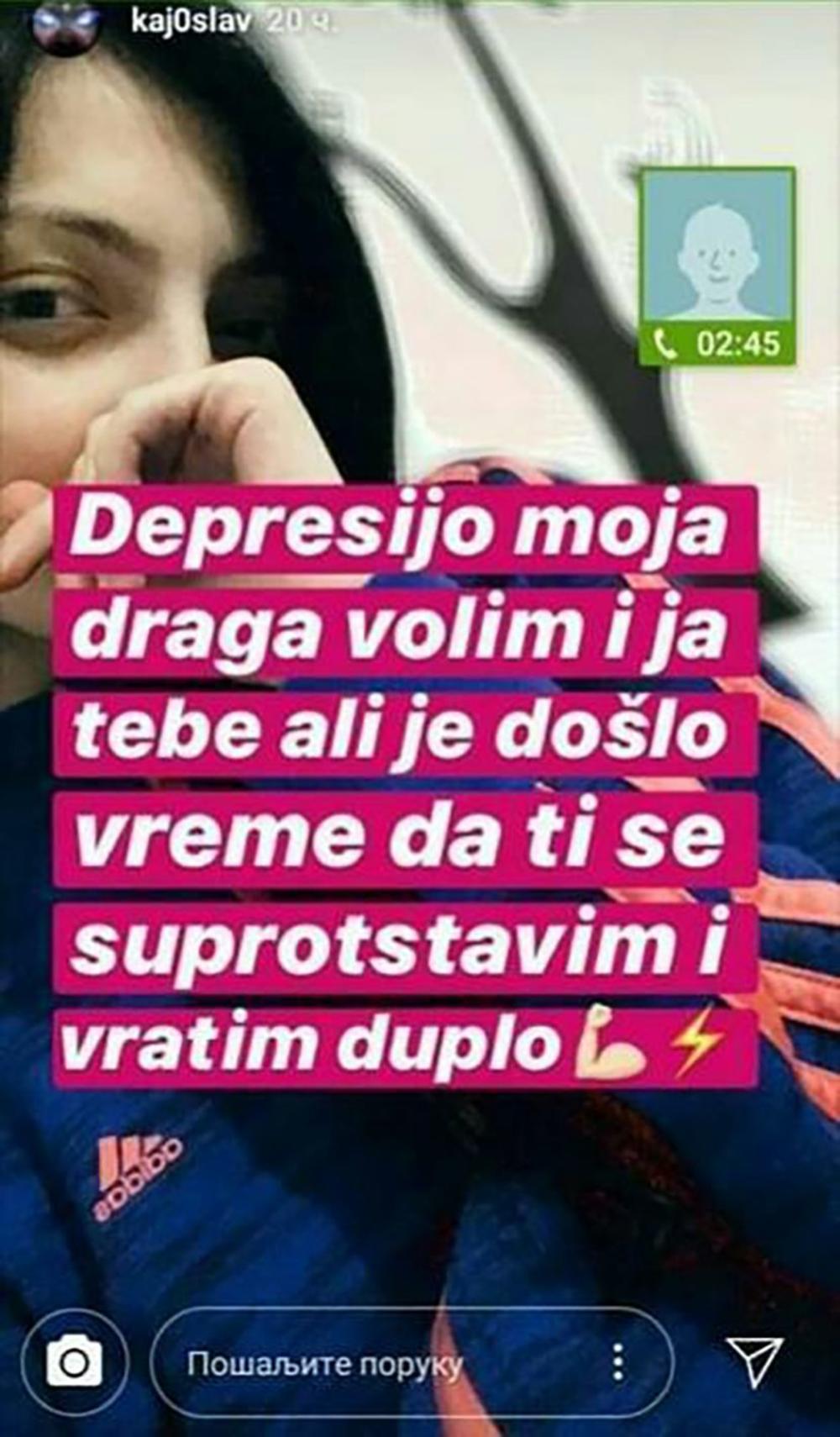 - Depresijo moja draga, volim ja tebe puno, ali je vreme da ti uzvratim duplo - napisala je nesrećna devojka na Instagram storiju, prenosi pančevački portal K-013. Storija više nema, jer je on vidljiv samo 24 sata, a nema ni Katarine... Ovaj sajt navodi i da je Katarina imala problem s društvom zbog oblačenja i muzike koju je slušala, te da su je mnogi osuđivali i omalovažavali.