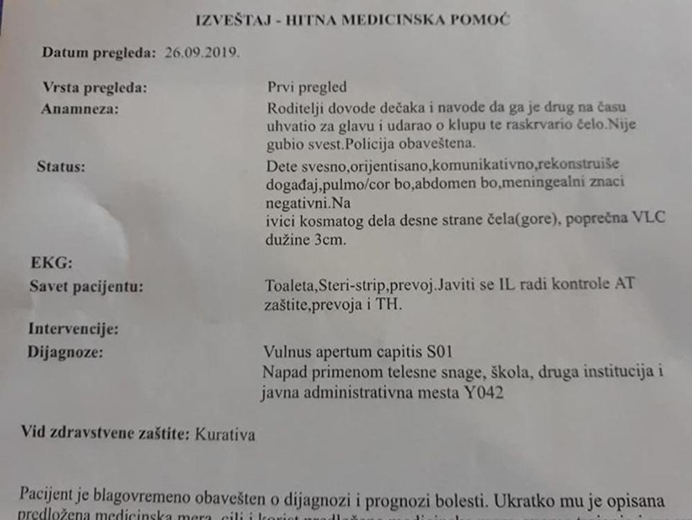 Njegova majka Jelena se pita, ako je dete povređeno na času, šta onda da roditelji i deca očekuju tokom odmora, prenosi Telegraf.