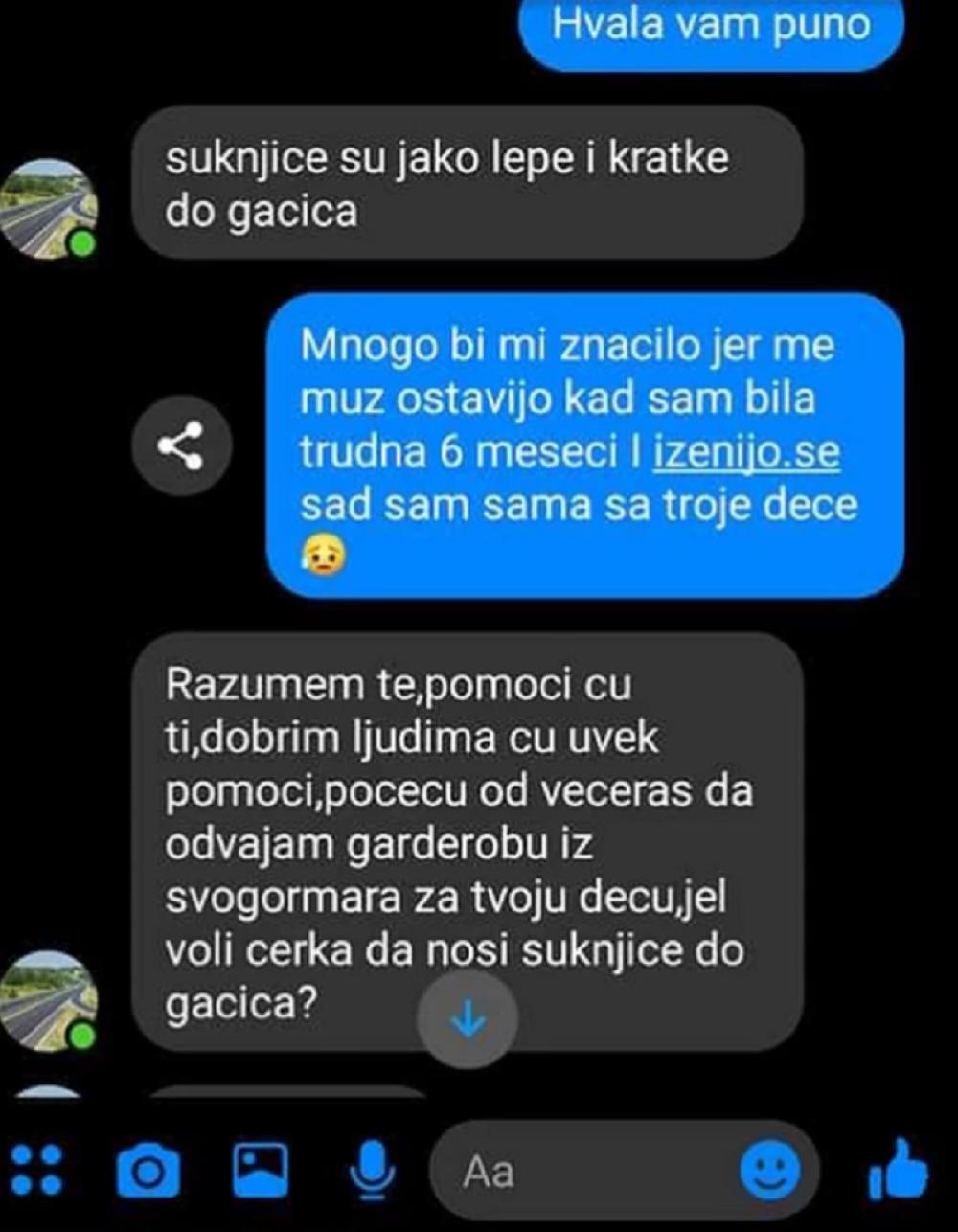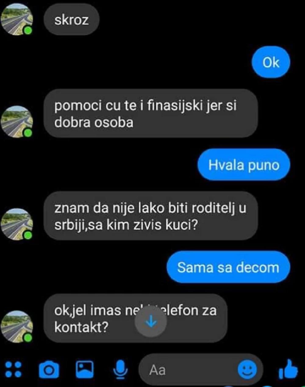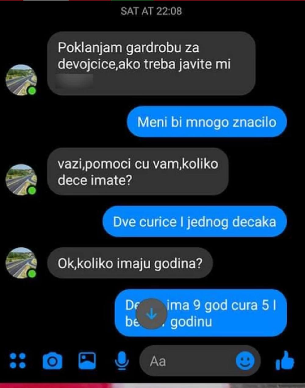 Šokantna prepiska se pojavila na društvenim mrežama, a sadržaj poruka koje su razmenjivali pedofil predator i majka čije smo ime sačuvali od javnosti, zgrozio je sve ponajviše zbog načina na koji je osoba koja se krila iza lika "doktorke Dragane Jovanović" pokušala da izvuče pornografski sadržaj od samohrane majke troje dece, čija je materijalan situacija veoma teška, pa je zbog pružene ruke i deteta obolelog od raka, pomislila da je pronašla svog dobrotvora i makar kratkoročni spas od bede.