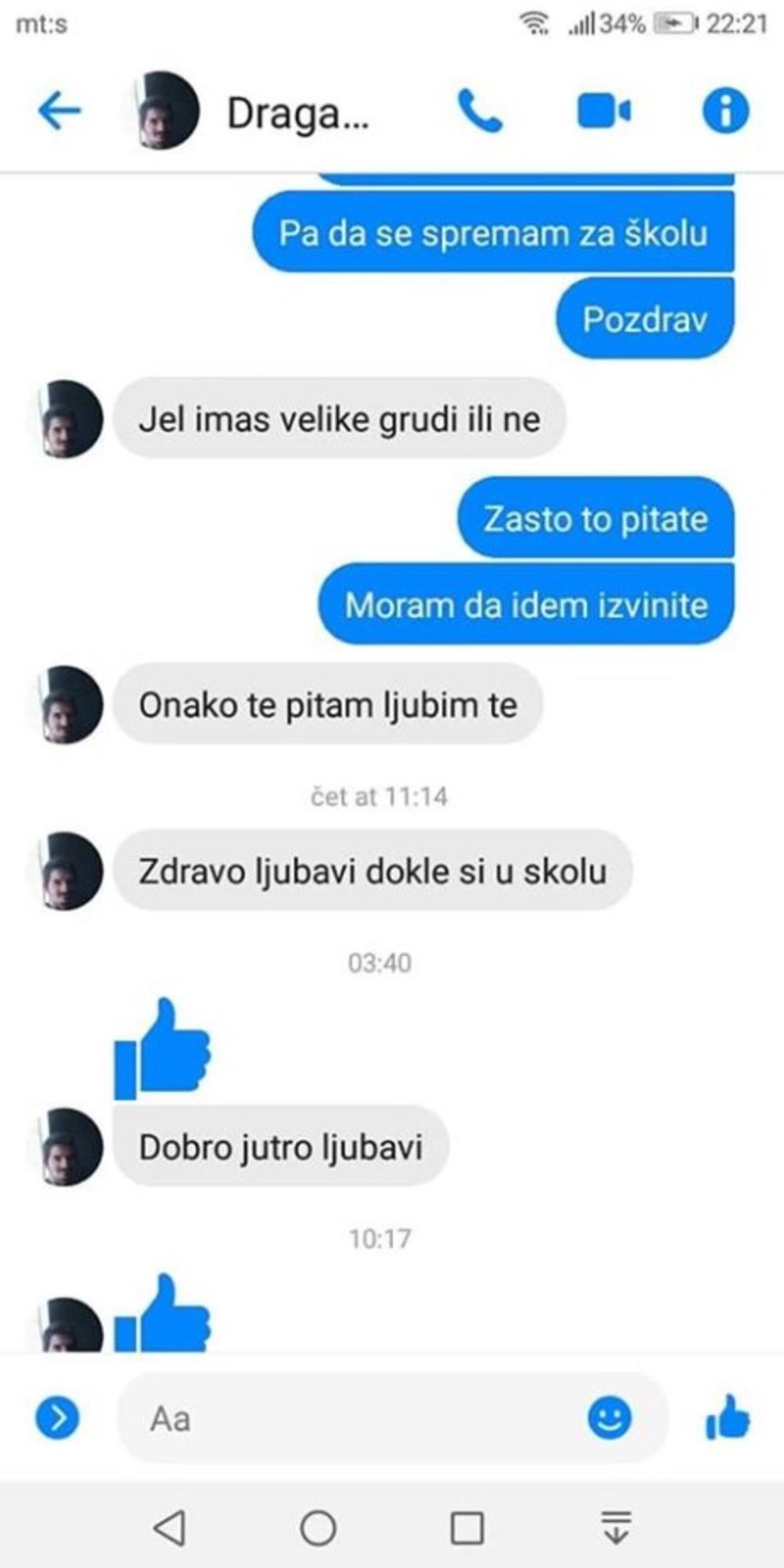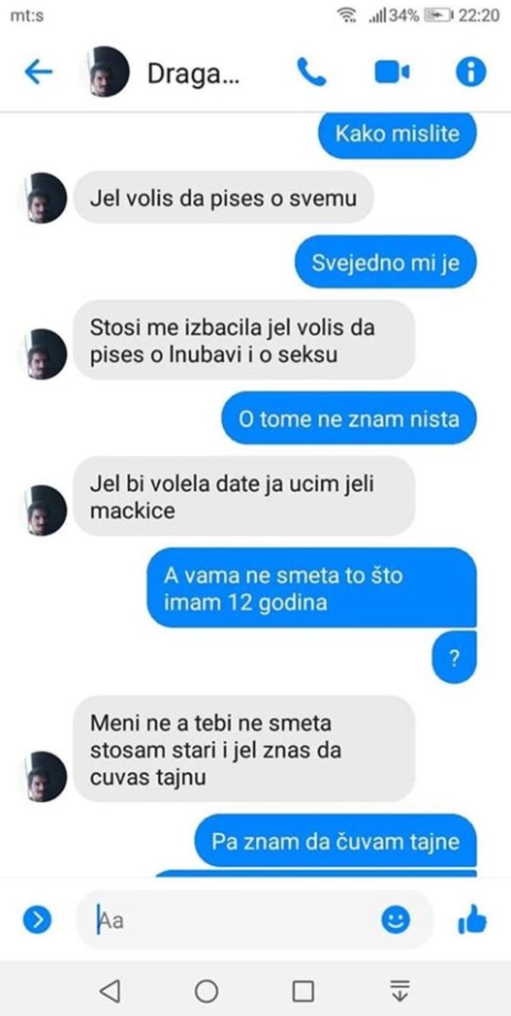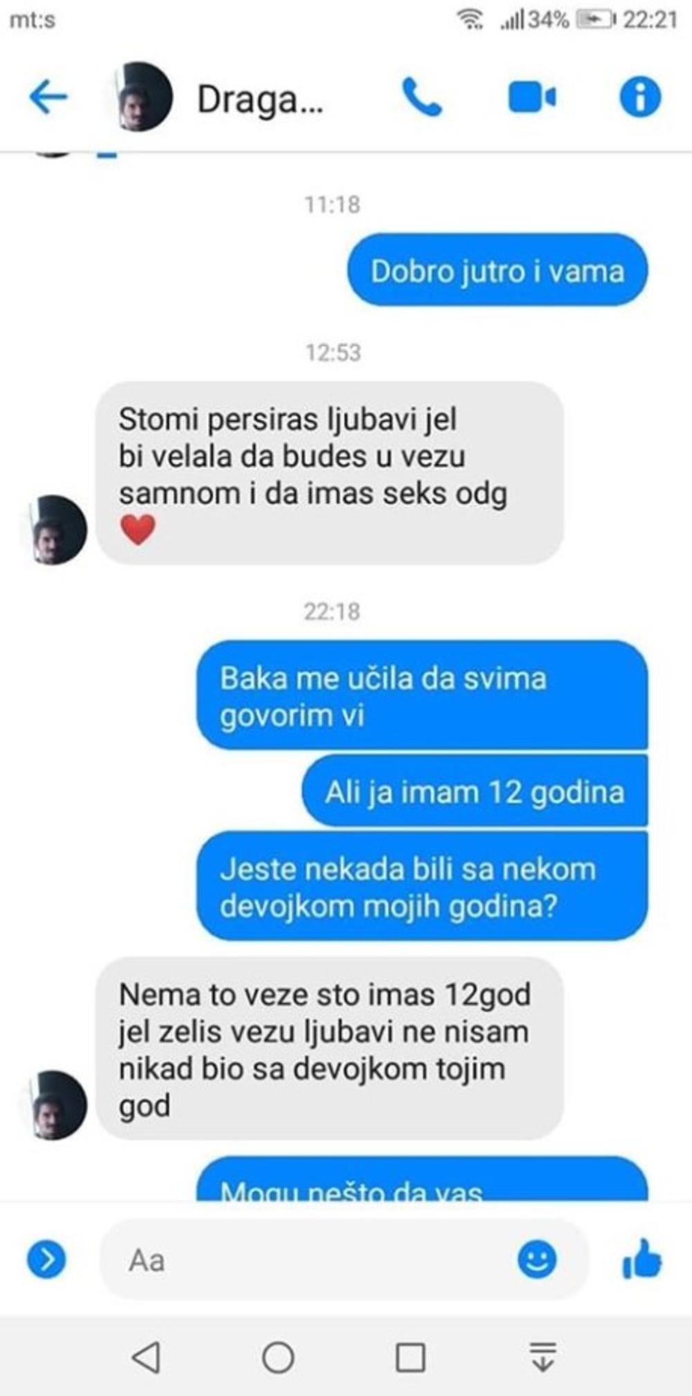 Naime, kako je objavljeno na jednoj stranici na Fejsbuku, on je diverziji devojčice od 12 godina slao poruke u kojima je pita da li voli da priča o s*ksu i da li bi želela da je on nauči.