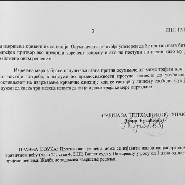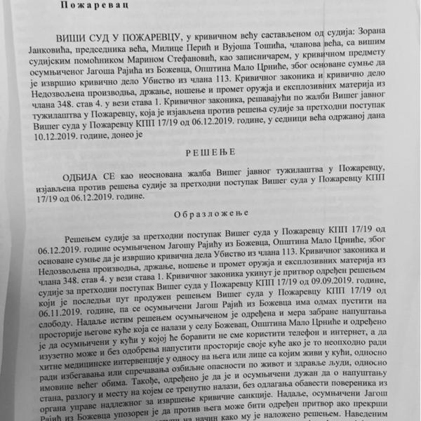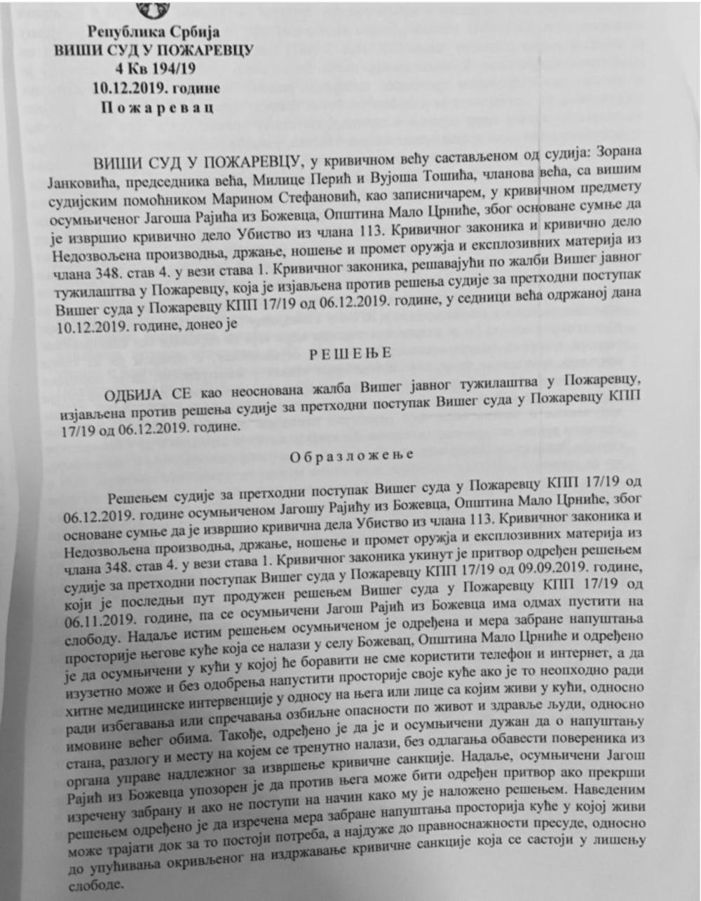 U rešenju Višeg suda u Požerevcu stoji da osumnjičeni Jagoš Rajić,zbog osnovane sumnje da je izvršio krivično delo ubistva, nedozvoljene proizvodnje, držanje nošenje i promete oružja biće pušten na slobodu, ali da mu je određen kućni pritvor.