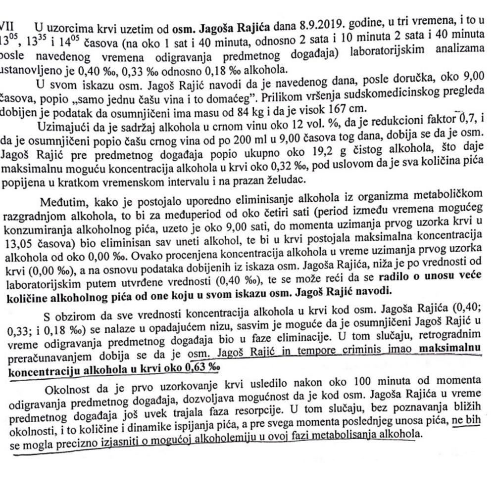 U izveštaju Opšte bolnice u Požarevcu utvrđeno je da je Rajić u trenutku ubistva imao alkohola u krvi, a osumnjičeni je u svom iskazu rekao da je popio samo jednu čašu vinu. Rezultati analize krvi pokazuju da je nakon incidenta imao 0,18 % alkohola u krvi.