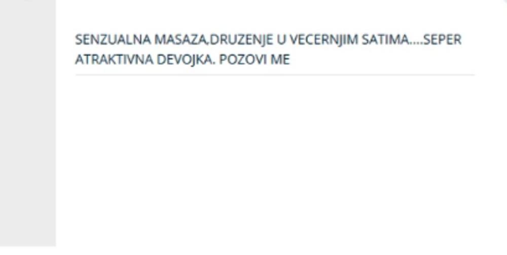 "Hiljadu evra dva sata, u luks smeštaju, samo ozbiljni. Poslati sliku na broj...", ispis je koji stoji na jednom od oglasa ispod fotografije atraktivne, gotovo nage, mlađe devojke na kojoj se vidi njena kratka crvena kosa i lice. Tu su i slike onih devojaka koje su, želeći da sakriju svoj identitet fotografisale samo grudi, zadnjicu ili oskudno odeveno telo, najčešće u provokativnom vešu.