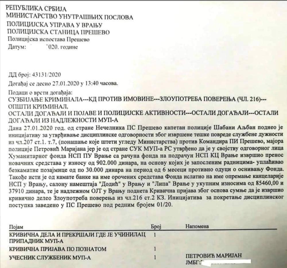 Protiv njega je podignuta krivična prijava 28. januara, a Osnovno tužilaštvo u Vranju pokrenulo je predistražni postupak zbog sumnje da je sa računa Fonda prebacio novac na podračun Nezavisnog sindikata policije KC Vranje, a od kamatom od oročenog novca Fonda platio opremanje kancelarije sindikata u Vranju.