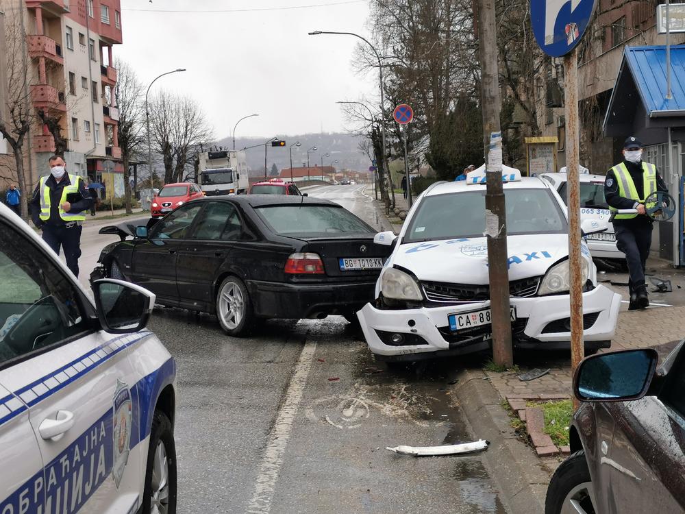 Do udesa je došlo kada je vozilo marke BMW, usled neprilagođene brzine, prešlo u suprotnu traku i udarilo u dva parkirana taksi vozila, od čega je jedno od siline udarca udarilo u stub, nezvanično saznaje agencija RINA.