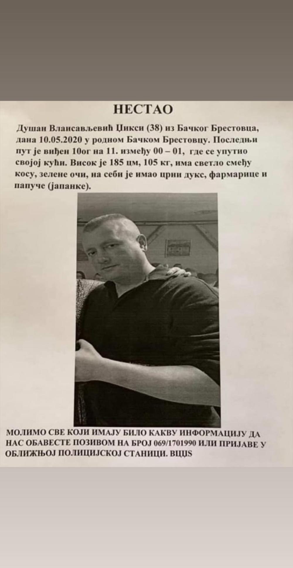 Tridesetosmogodišnji Dušan Vlaisavljević Džiksi nestao je u rodnom mestu Bačkom Brestovcu. Poslednji put je viđen u noći između 10.05 i 11.05, između 00:00-00:01 časova, kada se uputio ka svojoj kući.