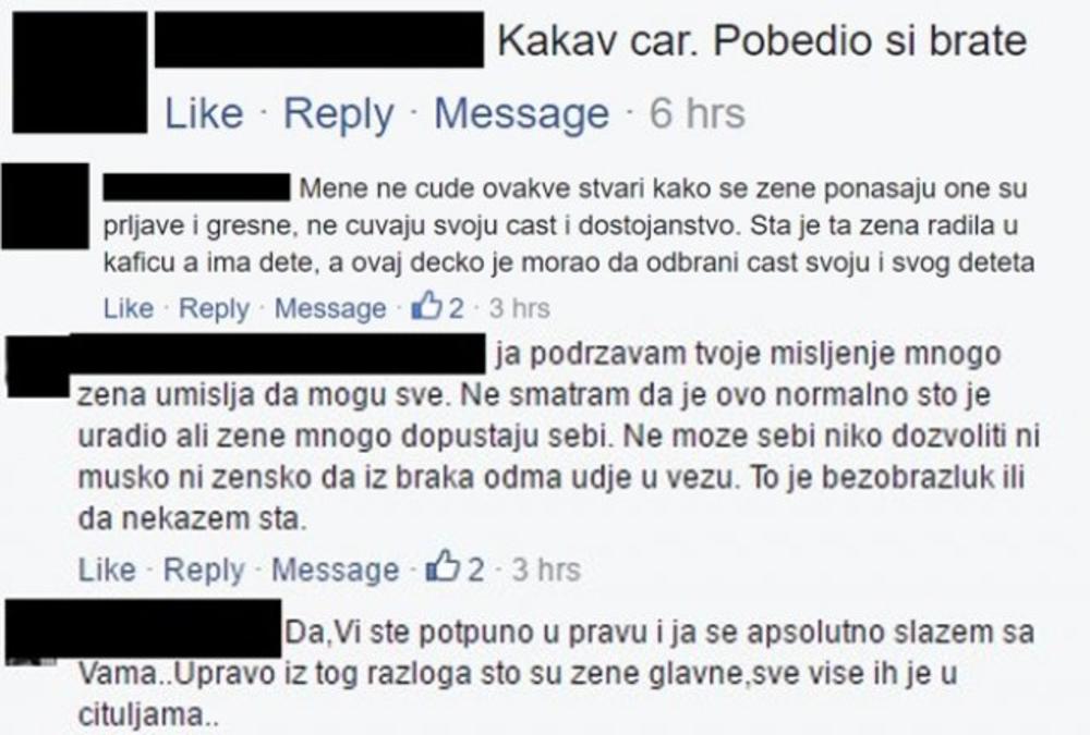 Pojedini korisnici Fejsbuka idu toliko daleko da krivicu stavljaju na teret žrtvama pitajući se "šta će njegova bivša sa drugim" ili konstatujući "da su žene glavne u Srbiji da ih je zato sve više u čituljama".