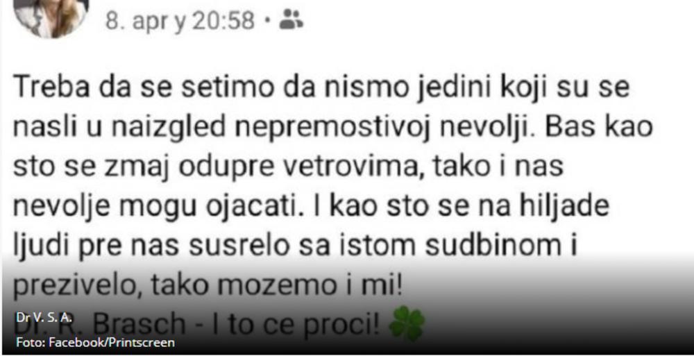 - Treba da se setimo da nismo jedini koji su se našli u naizgled nepremostivoj nevolji. Baš kao što se zmaj odupre vetrovima, tako i nas nevolje mogu ojačati. I kao što se na hiiljade ljudi pre nas susrelo sa istom sudbinom i preživelo, tako možemo i mi. Dr R. Brasch - i to će proći - napisala je na svom Fejsbuk proilu.