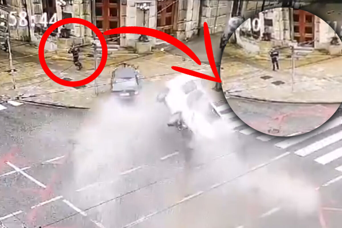 Naime, na snimku se vidi da je neposredno pored mesta nesreće stajao policajac koji je uspeo da se skloni u poslednjoj sekundi.