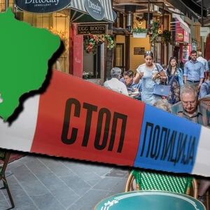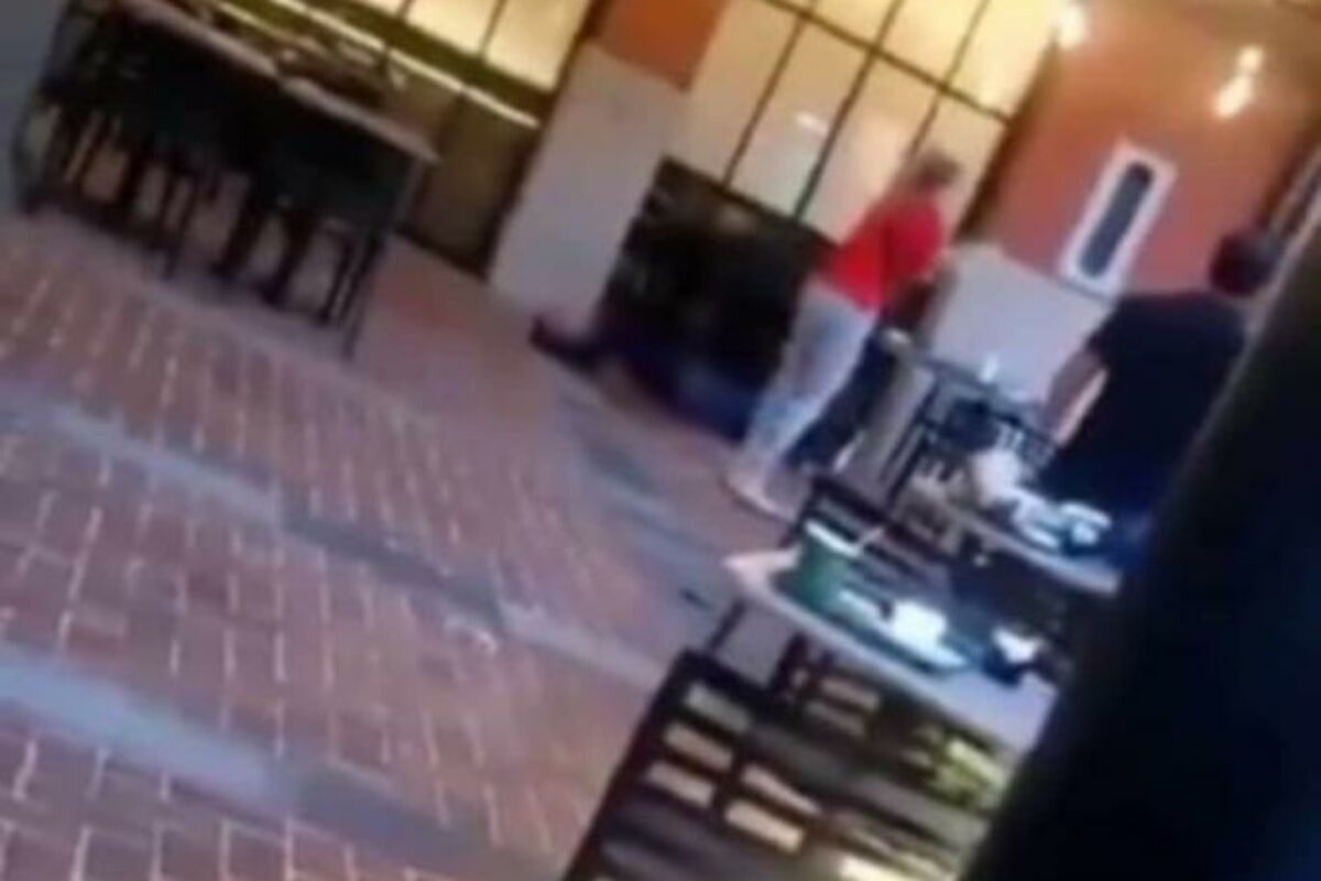 Na snimku se vidi ženska osoba koja na srpskom zapomaže, dok lokalno stanovništvo stoji ispred restorana.
