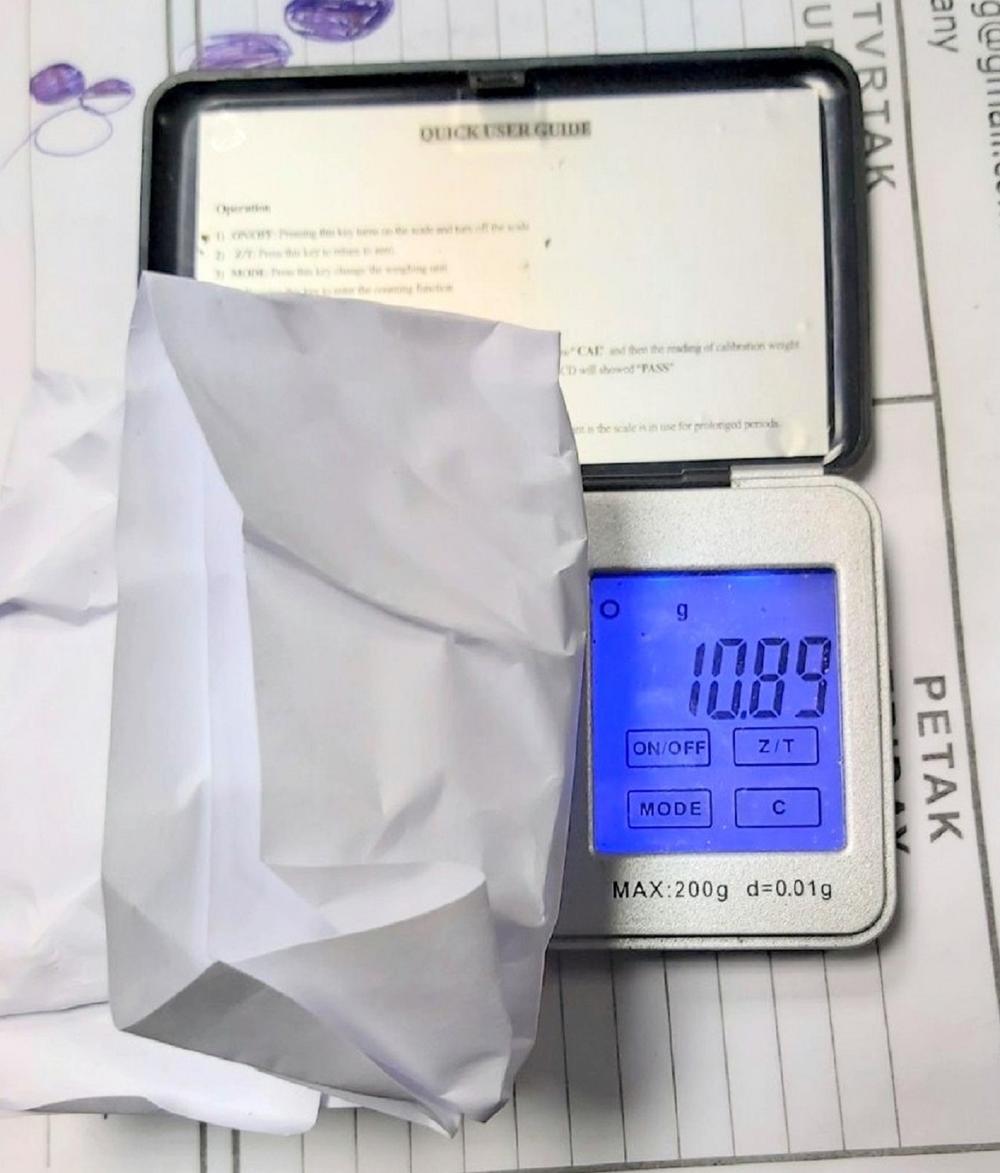 Odmah je izvršena provera korišćenjem priručnih testera za opojne droge čija je reakcija bila pozitivna na tu drogu. Ustanovljeno je da se radi o ukupno 33 tablete, ukupne težine 11,3 grama, koje su odmah predate policiji u dalju nadležnost.