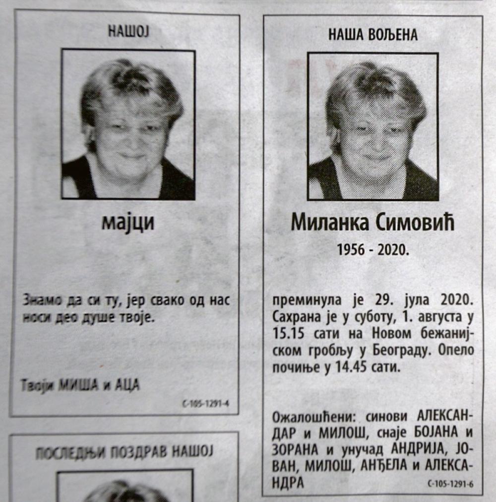 - Majka braće Simović sahranjena je u subotu, 1. avgusta, u 15.15 sati na Novom bežanijskom groblju na Novom Beogradu. Kovčeg je, posle opela, spušten u porodičnu grobnicu od crnog mermera, u kojoj počiva njen suprug Ilija. Sahrani su prisustvovali najuža rodbina i bliski prijatelji - navodi naš sagovornik.