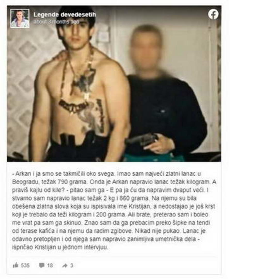 "Počeli su da prave lance preko pola kilograma. Najveći posle mene imao je Goran Bombaš, negde oko 750 grama sa nekim Bogorodicama. I onda sam ja pustio još neko vreme, rekoh hajde da čekam da vidim ko će još da napravi takav lanac da bude pametan. Svi su radili sve isto, Arkan je napravio zadnji u nizu jedan lanac sa velikim krstom, ja mislim da je bilo tačno sve ukupno jedan kilogram", rekao je Kristijan.