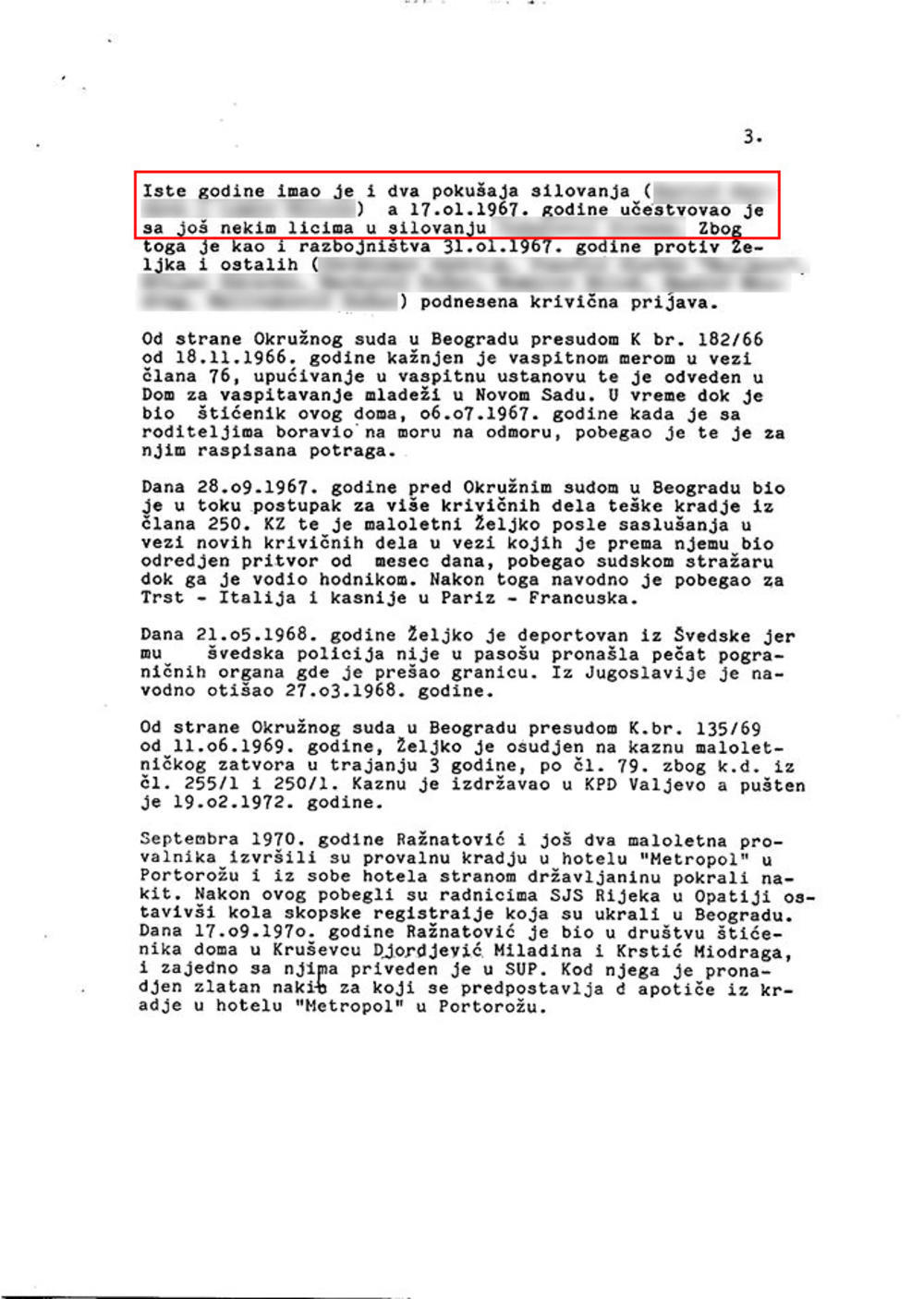 - Iste godine imao je i dva pokušaja silovanja (G. B. i M. L.), a 17. januara 1967. učestvovao je sa još nekim licima u silovanju T. Ž. Zbog toga, kao i zbog razbojništva, 31. januara 1967. protiv Željka i ostalih (I. K., P. S., H. Z., M. D., M. M., N. M. i M. D.) podnesena je krivična prijava - navodi DB.