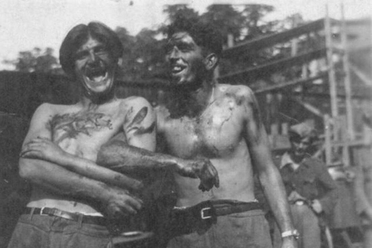 Da nema sačuvanog opisa ove fotografije mogao bi čovek da pomisli da se to samo dva mladića dobro zabavljaju, da su se možda namazali uljem dok su popravljali automobil.