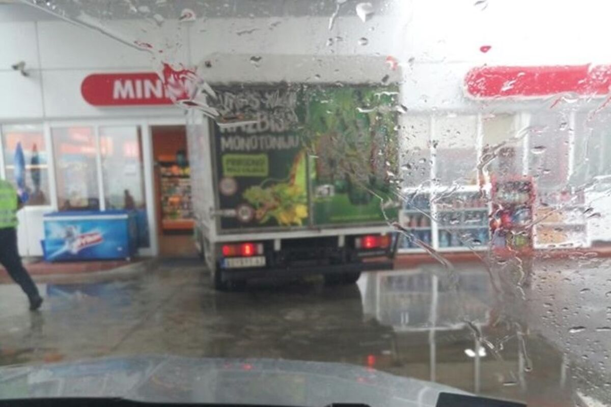 Vozač kamiona umesto da se uparkira pored točilice za gorivo se malo zaneo.