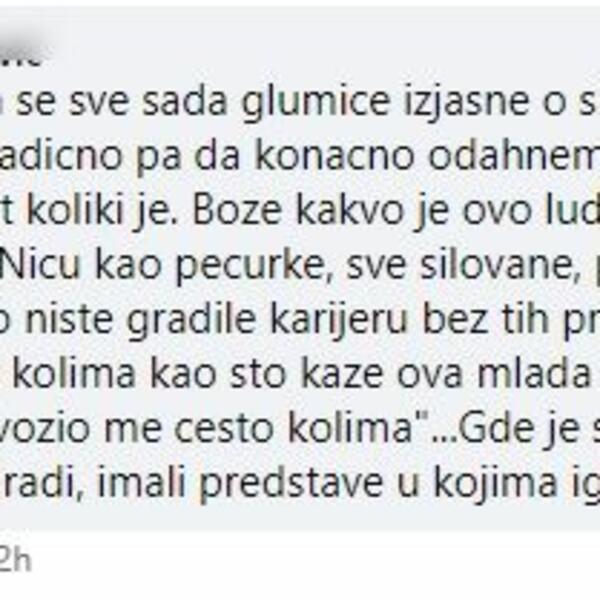 Naši stari su govorili: Nit' mi je rod, nit' pomozi Bog, ali većina očigledno ništa pametno nije naučila od svojih roditelja, baba i deda, pa na društvenim mrežama iznose salvu uvreda na račun žene u ovom slučaju Danijele koju uopšte ne poznaje, zna samo da je glumica koja je rešila da tuži nekog ko je po njenoj priči uradio nešto loše i tu bi trebalo da se završi polemika.Ima li ijedna glumica u ovoj državi da nije silovana. Sve svetice.