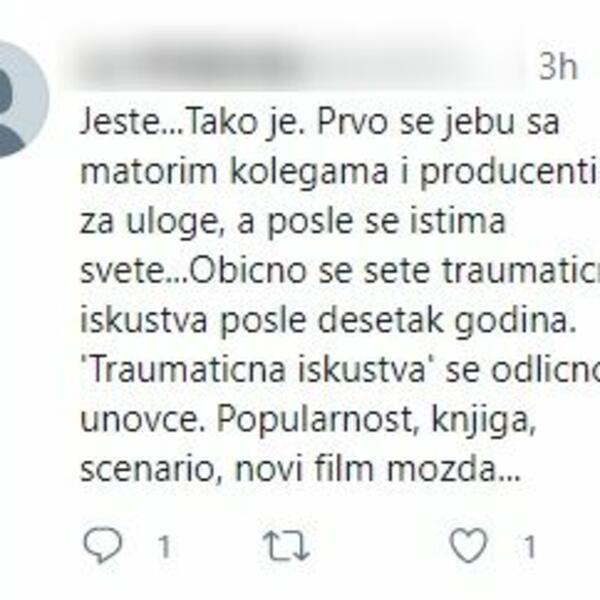 Jeste...Tako je. Prvo se je*u sa matorim kolegama i producentima, za uloge, a posle se istima svete...Obicno se sete traumaticnog iskustva posle desetak godina. 'Traumaticna iskustva' se odlicno unovce. Popularnost, knjiga, scenario, novi film mozda..., glasio je jedan od komentara na Tviteru na ovu temu