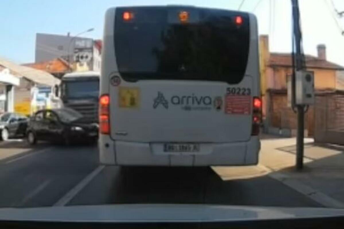 Na snimku sa ulica grada vidi se kako auto prolazi "kroz iglene uši" između kamiona, sa jedne, i autobusa, sa druge strane.
