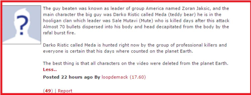 - Inače, Darka Ristića Medu trenutno "lovi" grupa profesionalnih ubica, i svi su sigurni da su mu dani na Zemlji odbrojani - piše u jednom od komenatara na sajtu Liveleak.com.