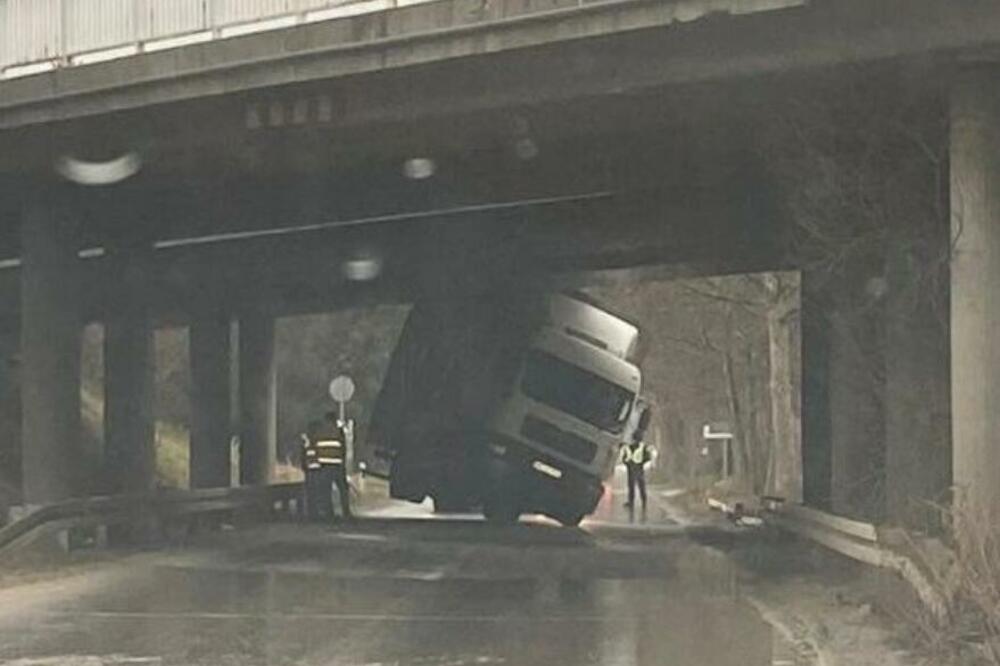 KAMION SE ZAGLAVIO KOD NADVOŽNJAKA: Nakrivio se ceo, blokira obe saobraćajne trake! (VIDEO)