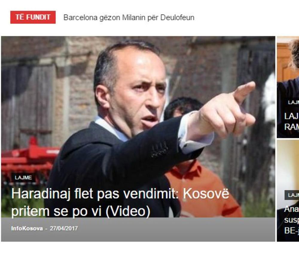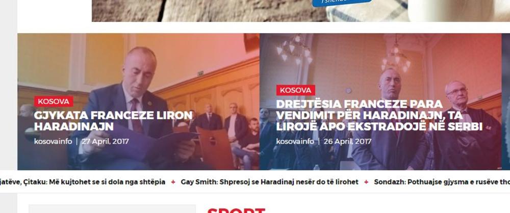 Sajt Kosova Info takođe na glavnoj najavi ima vest pod naslovom "Francuski sud oslobodio Ramuša Haradinaja".