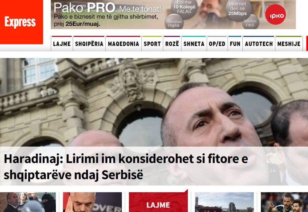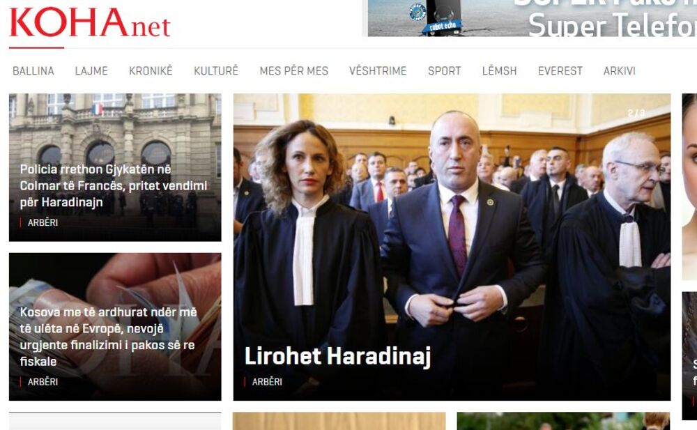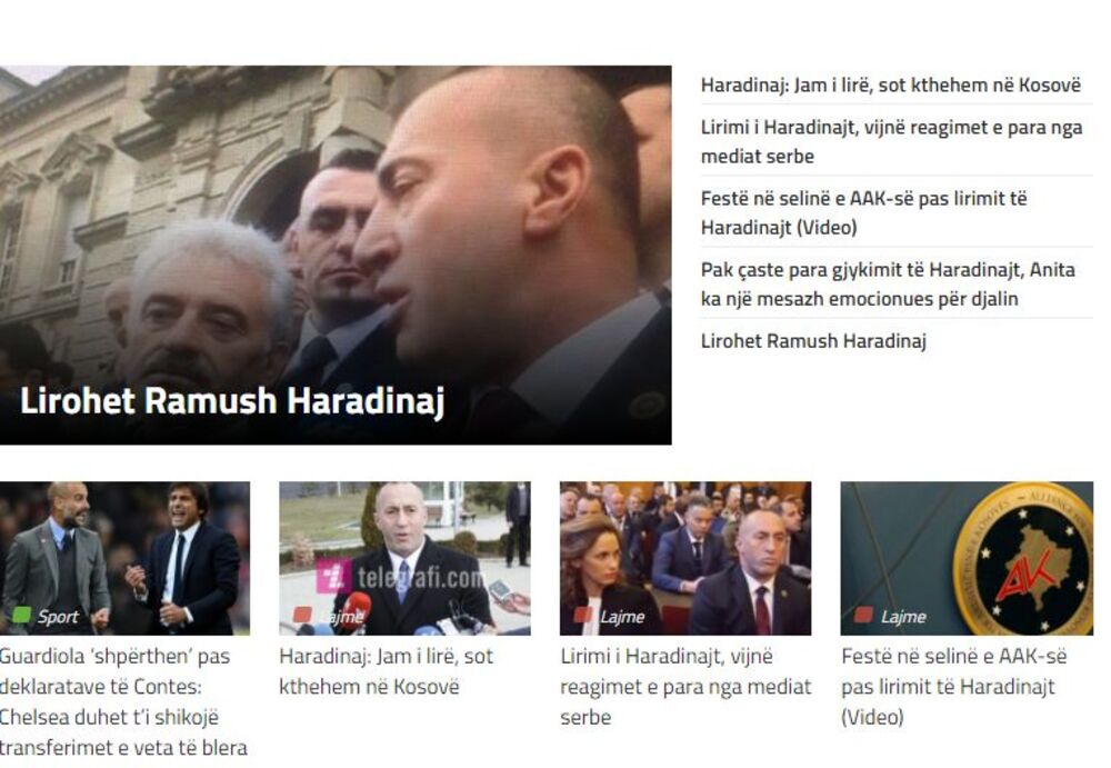 Na Koha.net glavna najava je "Oslobođen Haradinaj", sa slikom iz sudnice.