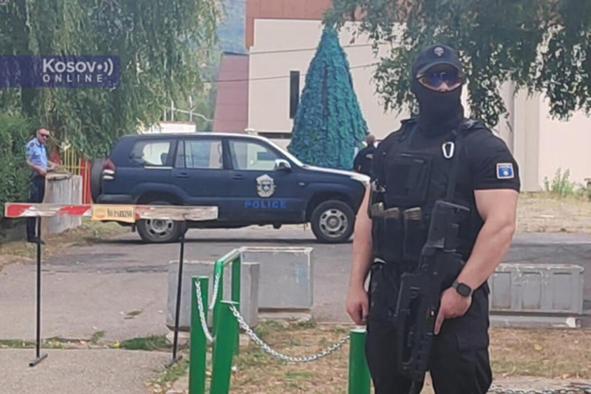 Policajci sa fantomkama i dugim cevima se nalaze ispred zgrade, kao i vozila kosovske policije.