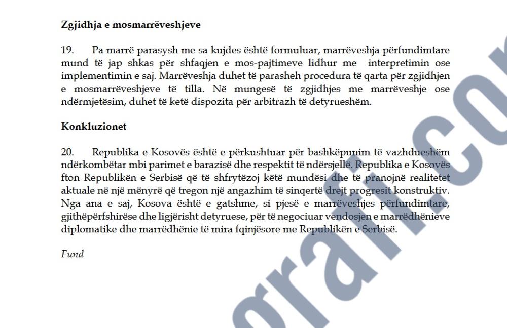 20. Republika Kosovo je posvećena stalnoj saradnji i ispunjavaju međunarodnih principa jednakosti i uzajamnog uvažavanja. Republika Kosovo poziva Republiku Srbiju da iskoristi ovu mogućnost i prihvati realnost na način koji pokazuje iskrenu posvećenost konstruktivnom procesu. Što se tiče Kosova, ono0 je spremno da kao deo konačnog sporazuma, inkluzivnog i pravno obavezujućeg, pregovara o uspostavljanju diplomatskih odnosa i dobrosusedskih odnosa sa Republikom Srbijom.