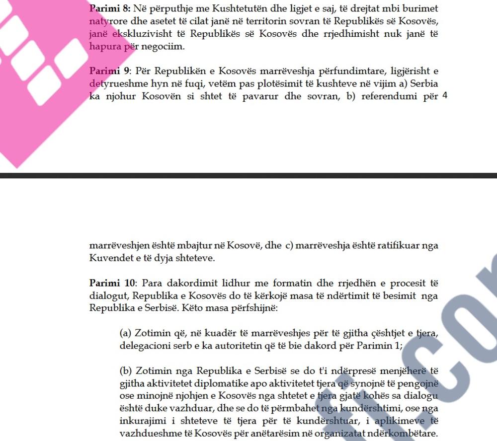 U skladu sa Ustavom i njegovim zakonima, prava na resurse i prirodna dobra koja su na suverenoj teritoriji Republike Kosovo, isključivo pripadaju Kosovu i nisu otvorena stavka za pregovore.