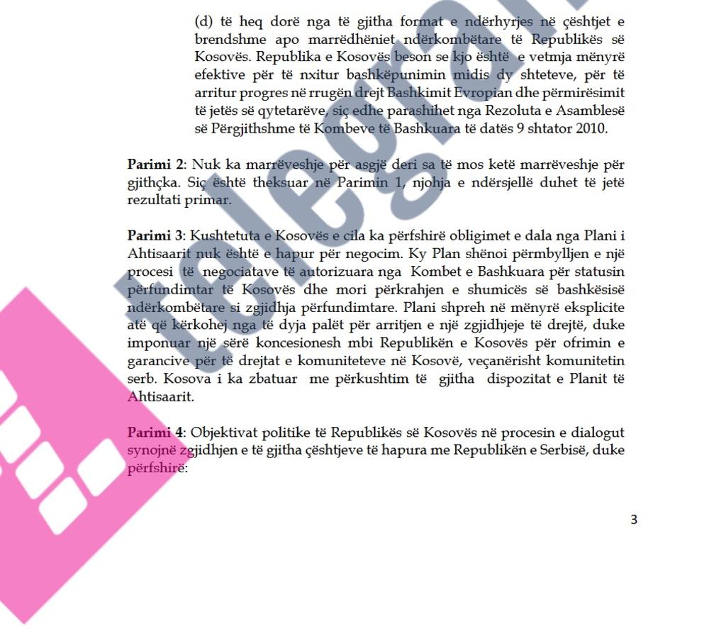 3. Kosovo očekuje da će se proces dijaloga intenzivirati i ubrzati u 2019. godini, kako bi se došlo do konkluzivnog i razumljivog sporazuma koji će biti pravno obavezujuć. Predmet ovog sporazuma je rešavanje svih otvorenih pitanja, što omogućuje obema državama da priznaju nezavisnost jedna drugoj i otvore put Kosovu na članstvu u EU i UN.
