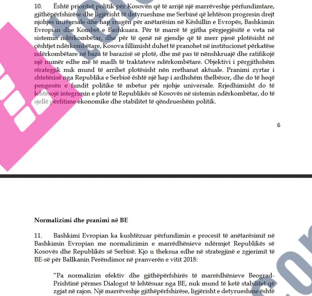 11. Evropska Unija je uslovila proces pristupanja Kosova EU normalizacijom odnosa između Kosova i Srbije. Ovo je takođe naglašeno u Strategiji proširenja EU na Zapadni Balkan u proleće 2018. godine: "bez efikasne i jasne normalizacije odnosa, kroz dijalog Beograd-Priština, ne može da postoji dugoročna stabilnost u regionu. Jasan i pravno obavezujući sporazum je hitan i neophodan, kako bi Srbija i Kosovo mogli da nastave na svojim putevima pristupanja EU".