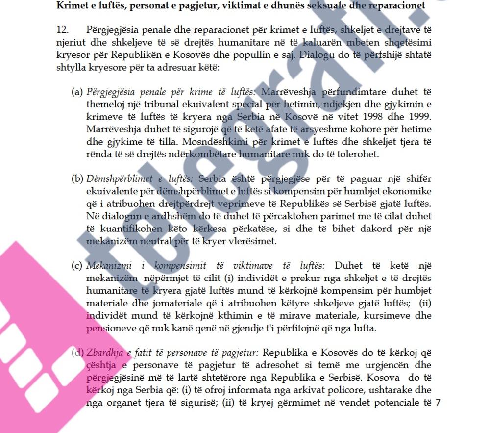12. Krivična odgovornost i reparacije za ratne zločine, kršenje ljudskih prava i kršenja humanitarnih zakona u prošlosti ostaju bitna stavka za Republiku Kosovo i njen narod. Dijalog će uključivati sedam glavnih stubova preko kojih će biti obrađivano ovo pitanje: