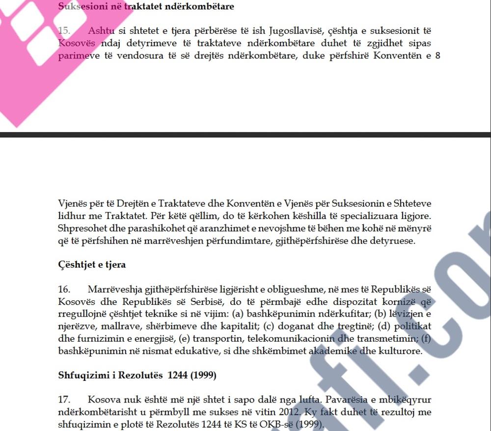 15. Kao i za druge države članice bivše Jugoslavije, pitanje sukcesije Kosova, kad je reč o obavezama u međunarodnim ugovorima, trebalo bi da se reši u skladu sa postojećim principima međunarodnih zakona, uključući Bečke konvencije o sporazumima o sukcesijama. U ovu svrhu biće potrebni specijalizovani pravni saveti. Nadamo se i anticipiramo da će neophodni dogovori biti postignuti ba vreme, kako bi bili uključeni u konačni, inkluzivni i obavezujući sporazum.