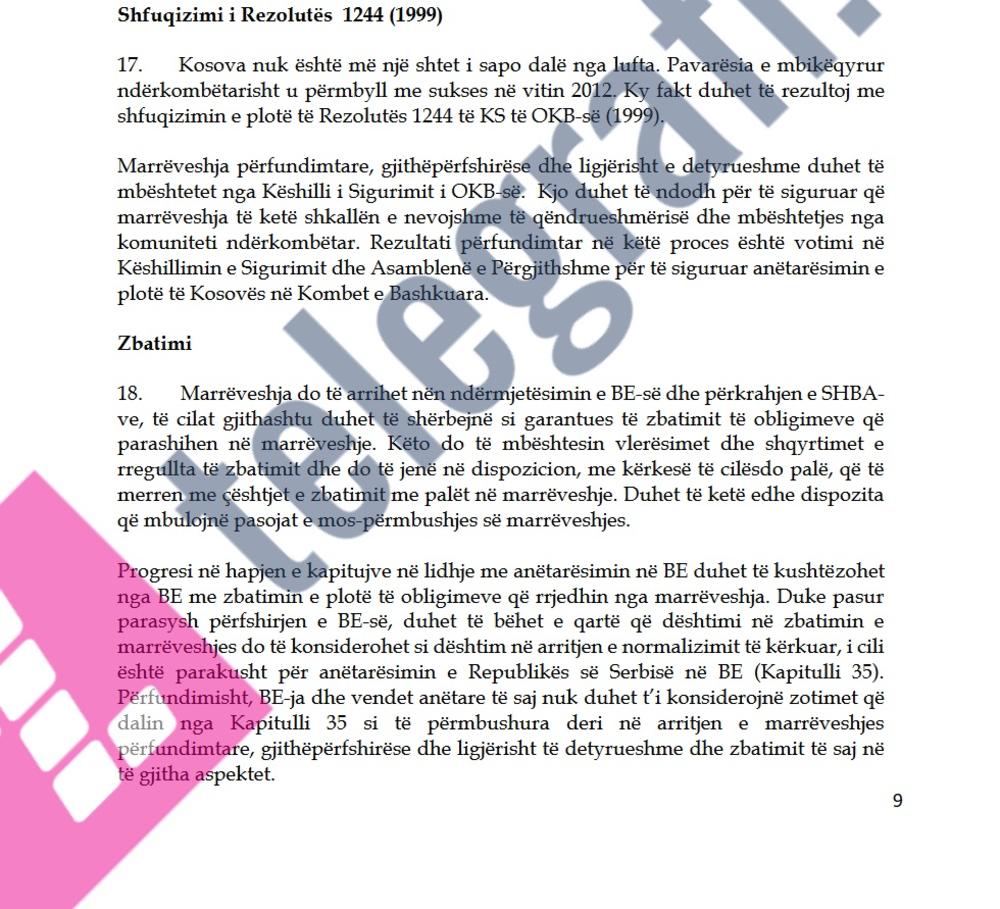 18. Sporazum će biti postignut pomoću medijacije EU i podrške SAD, što bi takođe trebalo da služi kao garancija za implementaciju obaveza koje se predviđaju sporazumom. Biće omogućeni izveštaji o implementaciji, na redovnoj osnovi, na zahtev druge strane, kako bi se rešila pitanja ostvarivanja odredbi sporazuma. Trebalo bi da postoje odrebde koje se bave neispunjavanjem odredbi sporazuma. Napredak u otvaranju poglavlja u procesu pridruživanju EU trebalo bi da bude uslov EU, kad je reč o punoj implementaciji obaveza koje proističu iz sporazuma. Kad je reč o ulozi EU, mora biti jasno da svaki neuspeh u ispunjavanju sporazuma mora da se posmatra kao neuspeh da se ostvari tražena normalizacije, što je preduslov za članstvo Srbije u EU (poglavlje 35). Na kraju, EU i njene zemlje članice ne treba da smatraju da su obaveze koje proističu iz poglavlja 35 ispunjene sve dok sporazum ne bude gotov, jasan i pravno obavezujući, i implementiran u svakom pogledu.