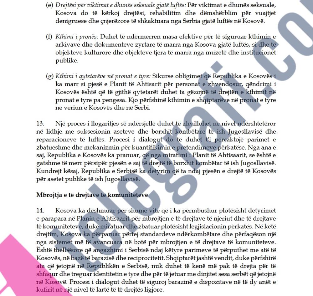 14. Kosovo je u dugom nizu godina dokazalo da je u potpunosti izvršilo svoje obaveze predviđene Ahtisarijevim planom, kad je reč o zaštiti ljudskih prava i prava zajednica, usvajanjem i punom implementacijom relevantnih zakona. U ovom smeru, Kosovo je prevazišlo međunarodne standarde i predstavlja jedan od najnaprednijih sistema na svetu, kad je reč o zaštiti prava zajednica. Od ključnog je značaja da postoji i uzajamno poštovanje ovih principa od strane Srbije, na osnovi jednakosti i reciprociteta. Albanci u inostranstvu, uključujući i one koji žive u Srbiji, ne bi trebalo da imaju manja prava u pokazivanju svog identiteta i dostojanstvenom životu od Srbija na Kosovu. Proces dijaloga bi trebalo da osigura jednakost sa obe strane granice, kad je reč o ovim pravima.