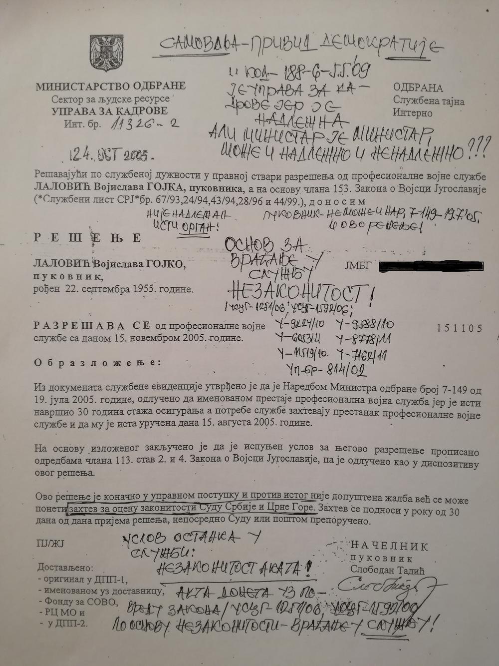 Kao pukovnik sa utvrđenim pravom na stan od 4.1.1993. god. imao sam sve uslove u prvenstvu za dobijanje stana u odnosu na lice kome je stan dodeljen, te sam uložio žalbu. Ulaganje te žalbe je za mene, moju porodicu i moju karijeru bilo pogubno. Jer ne samo da nije pozitivno rešena, već je doneto i rešenje o mom razrešenju iz profesionalne službe br. 11326-2 24.10. 2005. sa danom razrešenja 15.11.2005. godine, navodi Lalović.