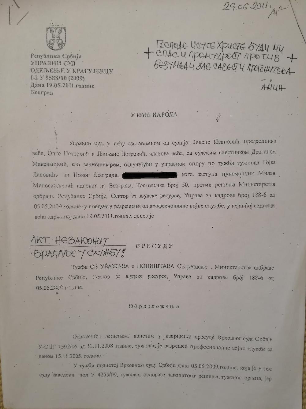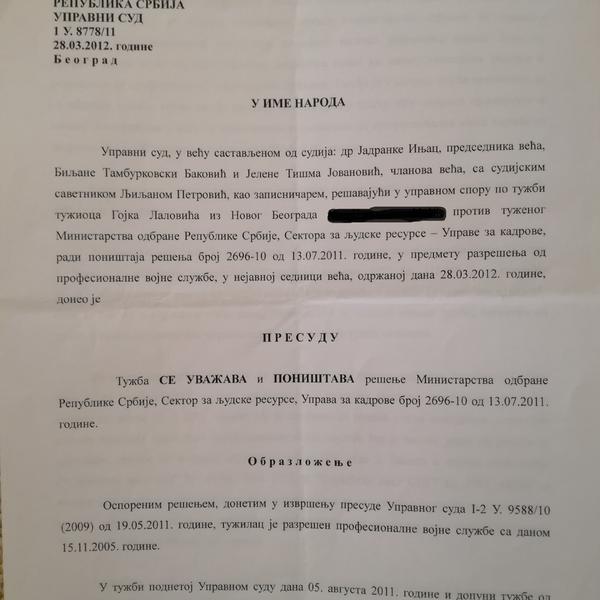 Međutim, ministar vojni (Šutanovac) ponovo ponavlja nezakonita akta i nezakoniti datum razrešenja 15.11.2005. Ponovljene tužbe pred Upravnim sudom sud je rešio presudama U 6053/11 30.6.2011. godine i U 8778/11 od 28.3.2012. godine koje su poništile naredbodavna akta i datum 15.11.2005. godine, a koje su za pukovnika Gojka Lalovića bile i konačne u vođenju sudskih sporova jer su decidno i nedvosmisleno ukazale na sve nezakonitosti i propuste ministra vojnog pri donošenju naredbodavnih akata i nevraćanja u službu.