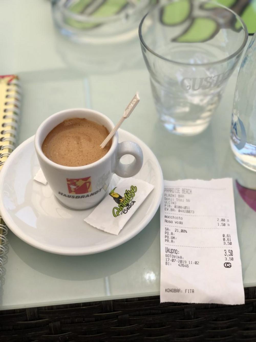Na fotografiji ispod moći ćete da vidite kako mala kafa u ovom mestu košta 2 evra, dok Koka kola košta 2.50 evra. Na drugim delovima ove plaže cene su i veće.