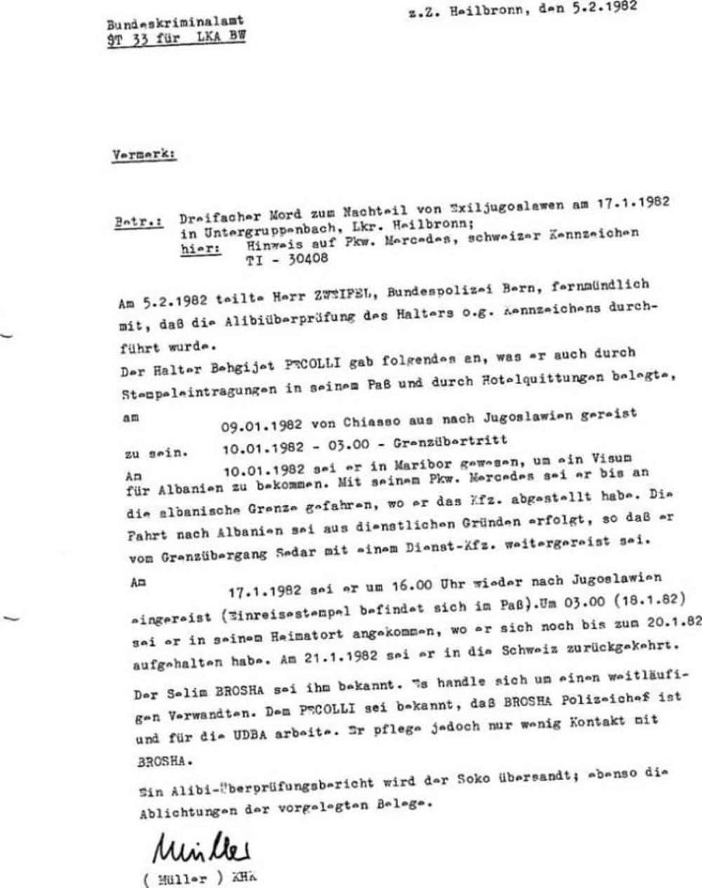 Oni su ubijeni 17. januara 1982. u Nemačkoj, a o Pacolijevoj umešanosti u ubistvo svedoči dokument Federalnog zavoda za kriminalistiku tadašnje Zapadne Nemačke. Ovaj dokument je do sada najdirektniji dokaz u Pacolijevu umešanost u u pomenuta ubistva.