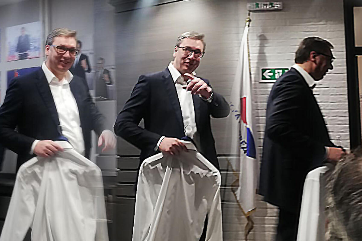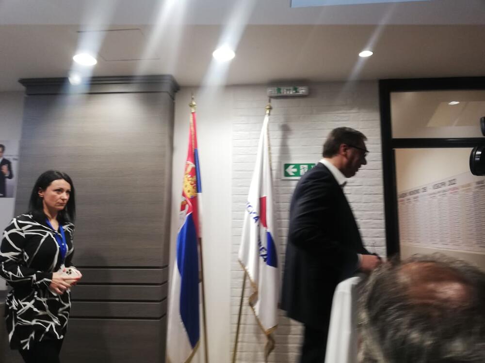 U Štabu Srpske napredne stranke zatekli smo predsednika Srbije Aleksandra Vučića koji je bio u žurbi, ali vidno raspoložen. Ono što smo primetili je da je u ruci nosio belu košulju, aktivistima je poželeo srećan rad, a onda je otišao u prostoriju u kojoj nisu drugi funkcioneri.