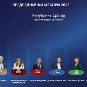 Kandidatkinja za predsednicu Srbije Milica Đurdjević Stamenkovski saopštila je večeras da, prema dosad obradjenom izbornom materijalu, ona ima 5,4 odsto glasova na predsedničkim izborima, a da je njena stranka Zavetnici na parlamentarnim izborima osvojila 4,6 odsto glasova birača.
