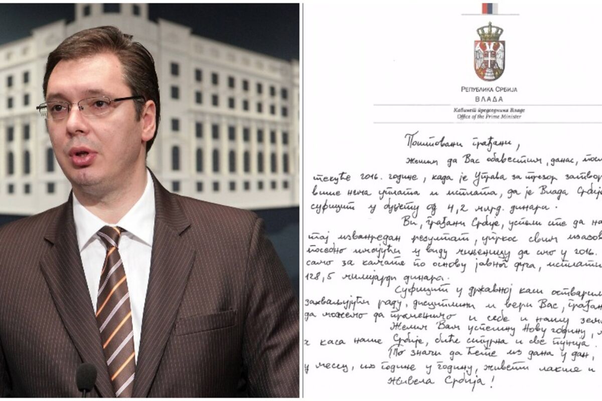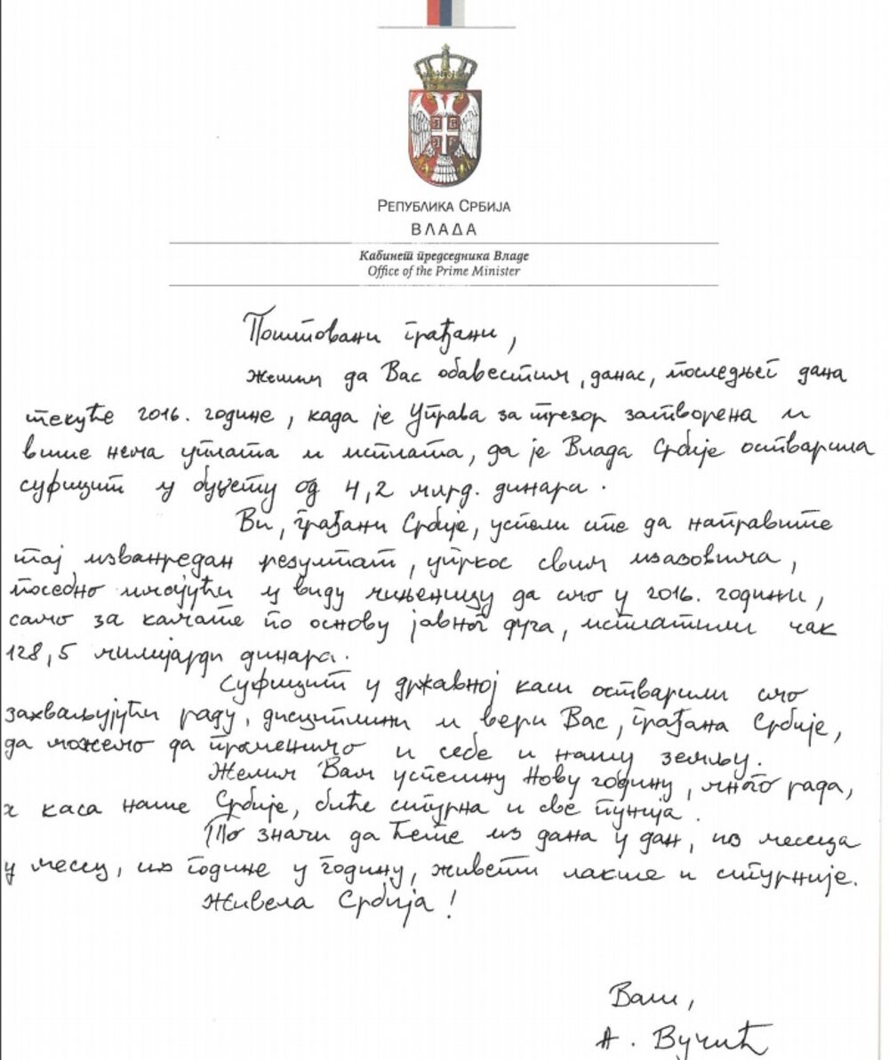 Vi, građani Srbije, uspeli ste da napravite taj izvanredan rezultat, uprkos svim izazovima, posebno imajući u vidu činjenicu da smo u 2016. godini, samo za kamate po osnovu javnog duga, isplatili čak 128,5 milijardi dinara. Suficit u državnoj kasi ostvarili smo zahvaljujući radu, disciplini i veri Vas, građana Srbije, da možemo da promenimo i sebe i našu zemlju. Želim Vam uspešnu Novu godinu, mnogo rada, a kasa naše Srbije, biće sigurna i sve punija. To znači da ćete iz dana u dan, iz meseca u mesec, iz godine u godinu, živeti lakše i sigurnije. Živela Srbija! Vaš, A. Vučić"